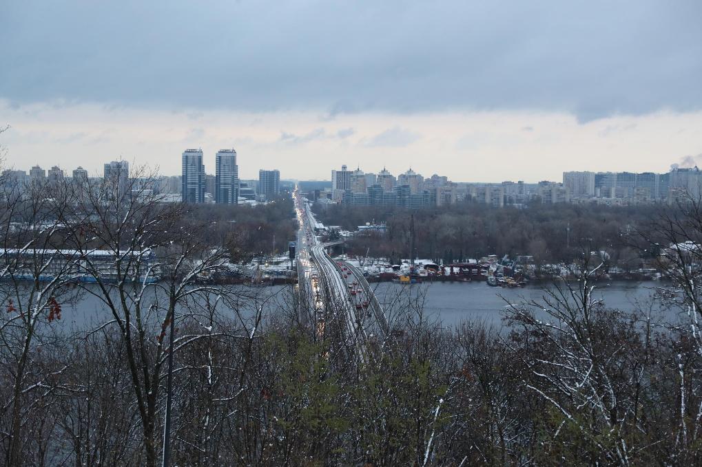 這是11月21日在烏克蘭首都基輔拍攝的白雪映襯下的地鐵橋和第聶伯河。當日,烏克蘭首都基輔迎來今冬初雪。新華社記者李東旭攝