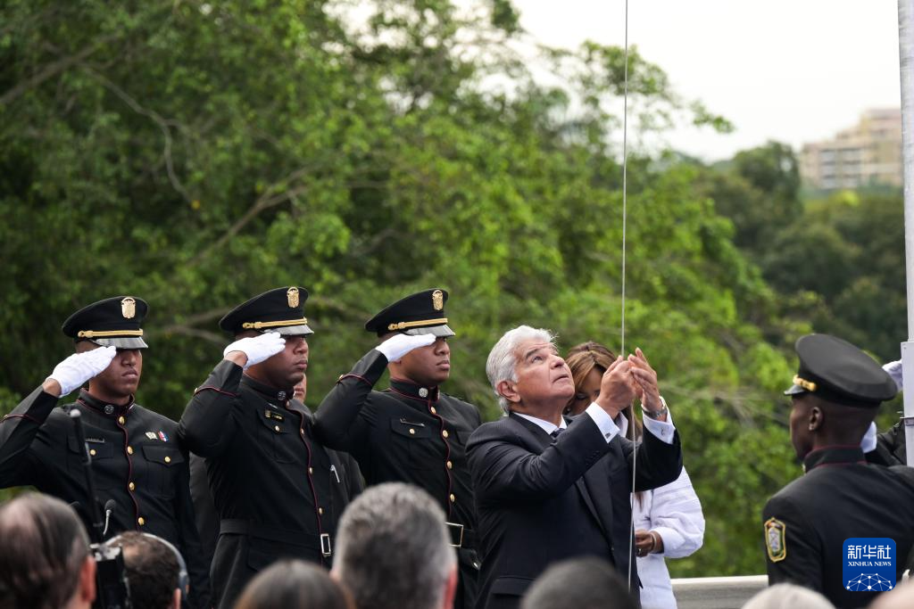12月31日,巴拿馬總統(tǒng)穆利諾(中)在首都巴拿馬城舉行的正式收回巴拿馬運(yùn)河主權(quán)25周年紀(jì)念活動上升起國旗。新華社記者 陳昊佺 攝