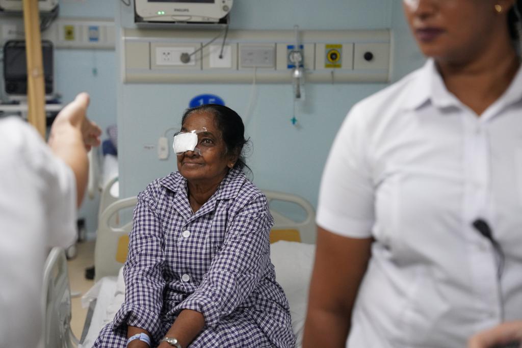 這是2024年12月24日在斯里蘭卡科倫坡港停靠的中國海軍“和平方舟”號醫(yī)院船上拍攝的剛進行完白內(nèi)障手術的本地患者。(新華社記者伍岳攝)