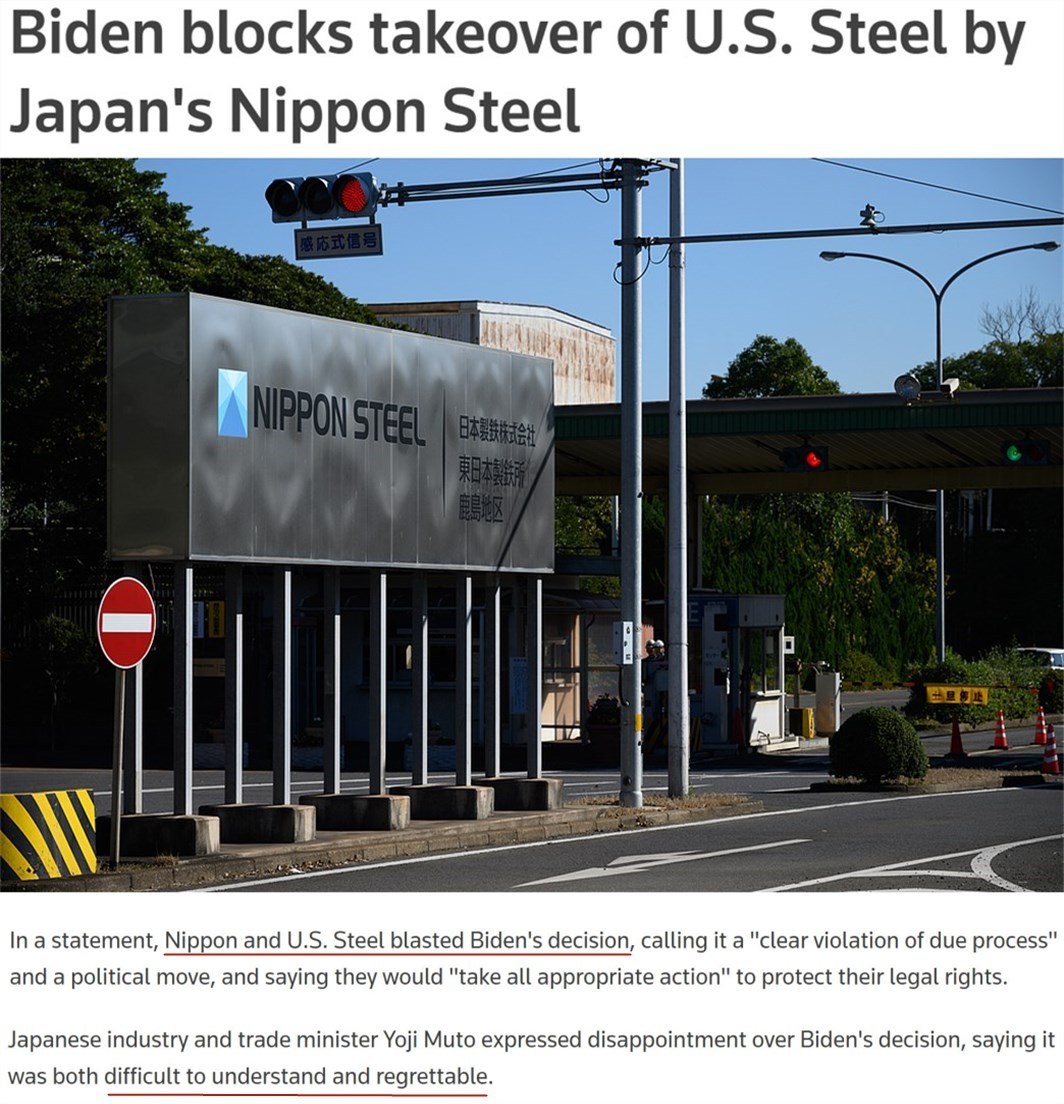 雖然日鐵多次讓步,但美國總統(tǒng)拜登當(dāng)?shù)貢r(shí)間3日發(fā)表聲明,正式阻止了這筆價(jià)值2萬億日元(按目前匯率約合127億美元)的交易。