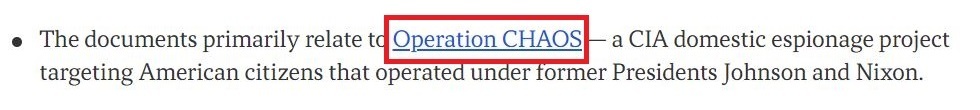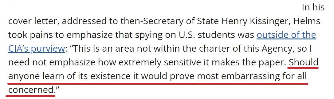 就像時任中情局局長赫爾姆斯1970年在寫給時任國務(wù)卿基辛格的信中所說,監(jiān)視美國學(xué)生不在中情局的職權(quán)范圍內(nèi),“如果有人知道了‘混沌行動’的存在,對所有相關(guān)者來說都將是非常尷尬的事情”。