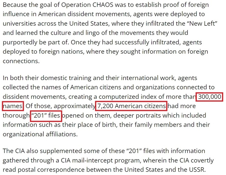 據(jù)悉,經(jīng)過這些“努力”,中情局收集了30多萬個與國內(nèi)民權(quán)運動有關(guān)的美國公民和組織的名字。其中約有7200名美國人被建立了更全面的所謂“201”檔案,涉及他們的出生地、家庭成員和組織隸屬關(guān)系等各種信息。