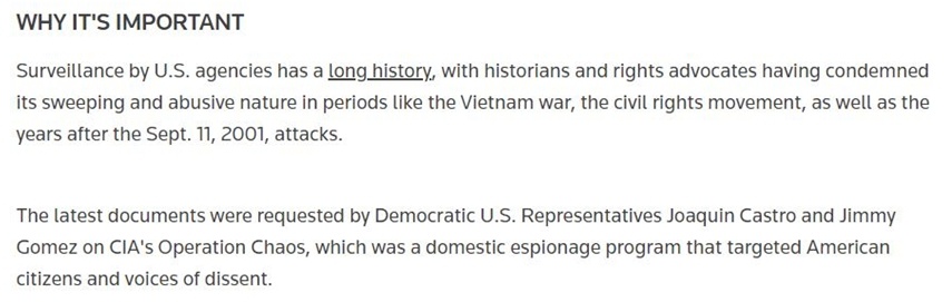 正如路透社所說,美國政府機構(gòu)的監(jiān)聽監(jiān)視行為歷史悠久,歷史學(xué)家和民權(quán)倡導(dǎo)人士在越南戰(zhàn)爭時期、民權(quán)運動時期以及“9·11事件”發(fā)生后的歲月里,都曾譴責過這種行為的廣泛和濫用性質(zhì)。