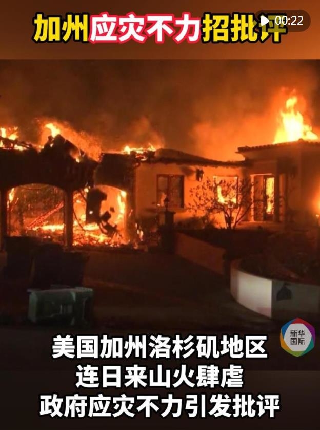 美國加利福尼亞州洛杉磯地區(qū)連日來山火肆虐,截至11日已造成16人死亡,至少13人失蹤,上萬棟房屋被燒毀。州及地方政府應(yīng)災(zāi)不力引發(fā)批評。