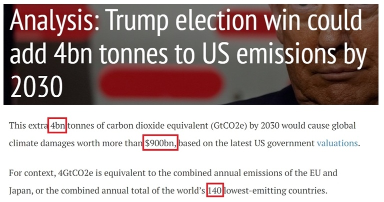 有報(bào)告指出,相對(duì)于目前水平,特朗普的再度掌權(quán)將讓美國(guó)到2030年的碳排放累計(jì)增加40億噸二氧化碳當(dāng)量,比全球排放量最少的140個(gè)國(guó)家的排放總和還要多。