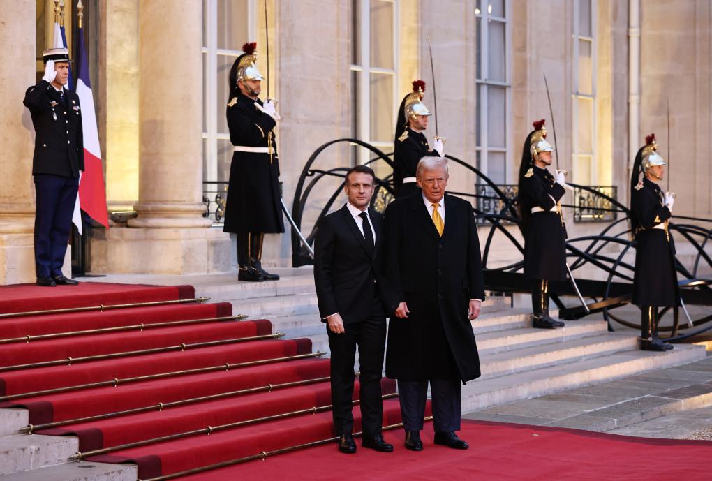 2024年12月7日,法國總統(tǒng)馬克龍(前左)在巴黎總統(tǒng)府愛麗舍宮歡迎特朗普(前右)。新華社記者 高靜 攝