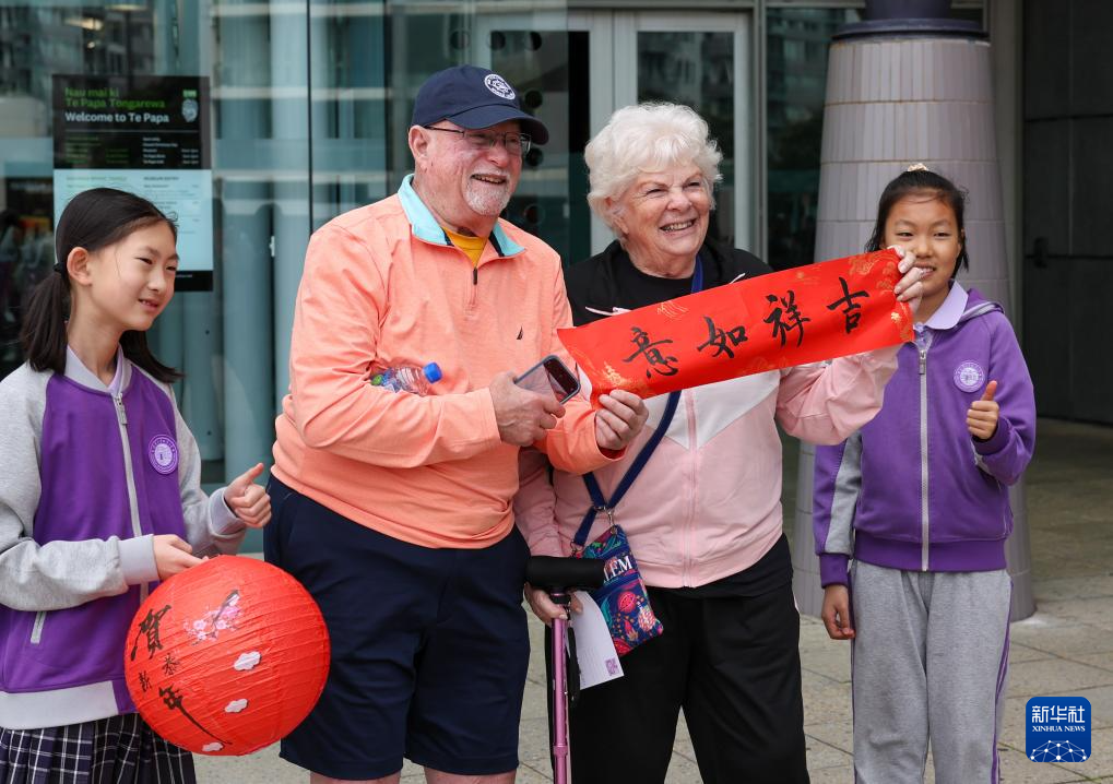 2月1日,在新西蘭首都惠靈頓,當(dāng)?shù)鼐用裨诙嘣逡嵯灿瓪g樂(lè)春節(jié)活動(dòng)中展示中國(guó)書(shū)法作品。新華社發(fā)(孟韜攝)