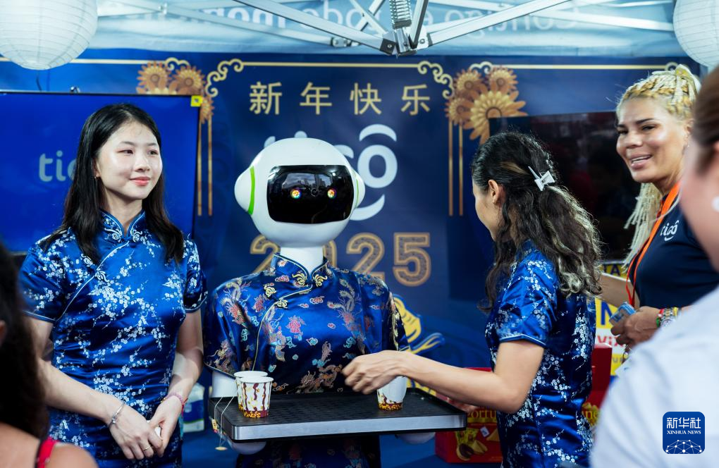 1月31日,在巴拿馬首都巴拿馬城的華僑華人歡樂(lè)春節(jié)廟會(huì)上,機(jī)器人為游客送上中國(guó)茶水。新華社記者 許詠政 攝