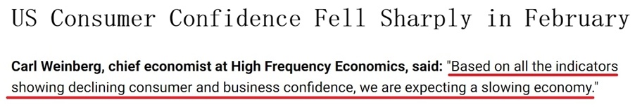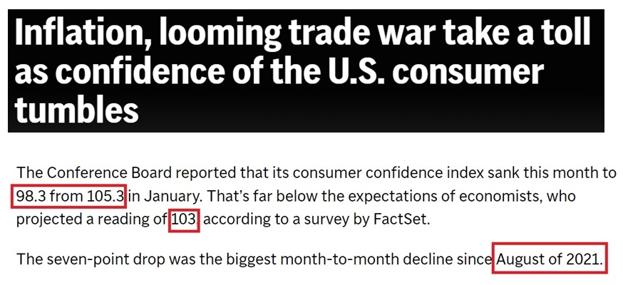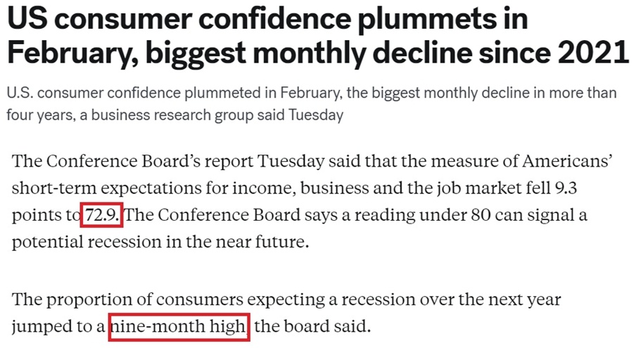 各家媒體紛紛用“暴跌”“直線下降”“急劇惡化”等詞匯來形容美國(guó)消費(fèi)者信心的顯著下滑。
