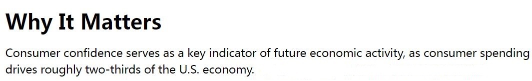 CCI既反映美國(guó)人對(duì)當(dāng)前經(jīng)濟(jì)狀況的評(píng)估,也反映他們對(duì)未來六個(gè)月的展望,是預(yù)測(cè)美國(guó)未來經(jīng)濟(jì)前景的關(guān)鍵指標(biāo)。