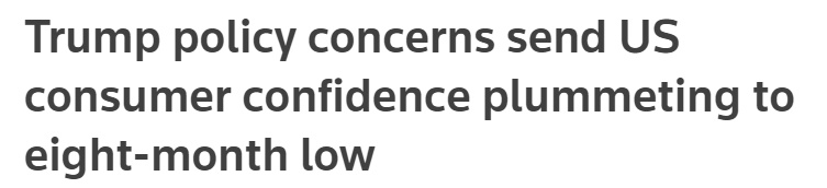 報(bào)道稱,特朗普是因?yàn)橄蛎绹?guó)人承諾會(huì)降低通脹和物價(jià)才當(dāng)選總統(tǒng)的。在他獲勝后,美國(guó)企業(yè)和消費(fèi)者信心曾一度飆升。但他在上任后的僅僅一個(gè)月內(nèi)就宣布了連串加征關(guān)稅計(jì)劃,從而“導(dǎo)致美國(guó)消費(fèi)者信心暴跌至八個(gè)月以來的最低點(diǎn)”。