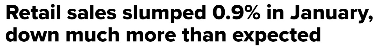 與此相應(yīng)地,美國(guó)1月零售額環(huán)比下降0.9%,大大超出此前下降0.2%的預(yù)期,創(chuàng)下近兩年來的最大月度環(huán)比跌幅。
