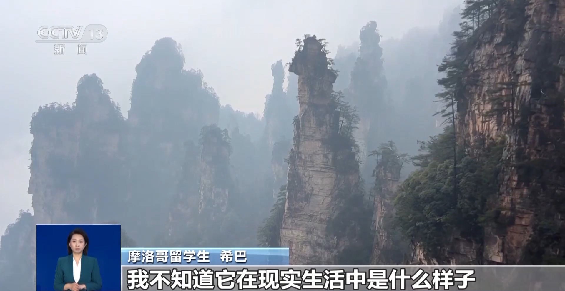 摩洛哥留學(xué)生 希巴:看完電影后我想去張家界,我不知道它在現(xiàn)實(shí)生活中是什么樣子,但它看起來就像天堂,整個(gè)水域,山脈,一切都非常棒,美麗。