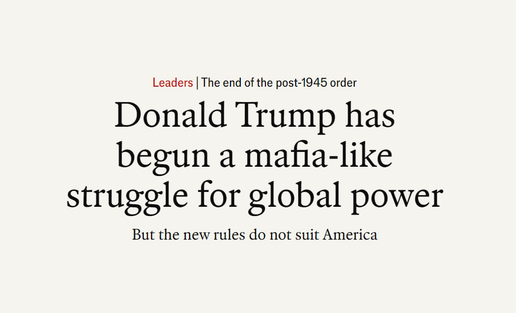 英國《經(jīng)濟(jì)學(xué)人》網(wǎng)站近期刊文稱,美國總統(tǒng)特朗普已經(jīng)開啟一場黑手黨式的全球權(quán)力爭奪。1945年后建立的世界秩序正在加速撕裂。一個(gè)強(qiáng)權(quán)即公理、小國受欺負(fù)的世界正快速到來。文章摘要如下: