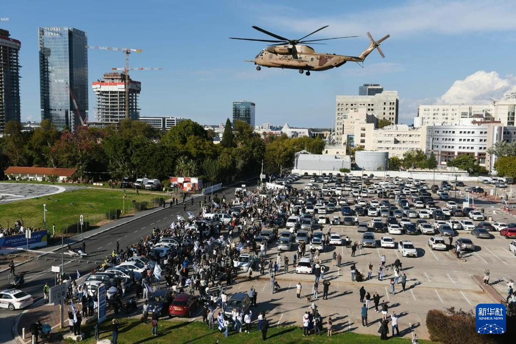 1月25日,搭載獲釋以色列被扣押人員的直升機抵達以色列佩塔提克瓦的一所醫(yī)院。新華社/基尼圖片社