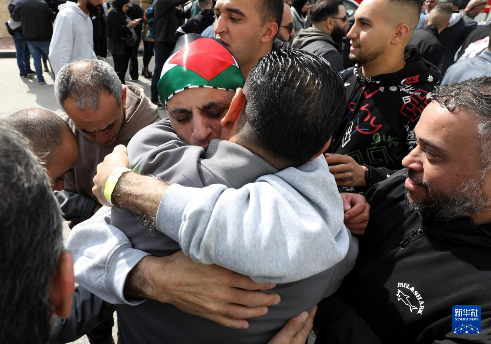 2月1日,在約旦河西岸城市拉姆安拉,人們擁抱獲釋的巴勒斯坦人。以色列當天釋放了183名被扣押人員。新華社發(fā)(艾曼·諾巴尼 攝)