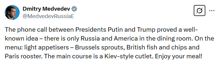 俄羅斯總統(tǒng)普京同特朗普18日通電話。俄聯(lián)邦安全會(huì)議副主席梅德韋杰夫就此表態(tài)稱,這表明餐廳里只有俄美,歐洲和烏克蘭都在菜單上,歐洲是開胃小菜,而主菜是烏克蘭。