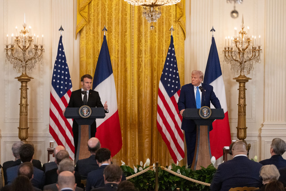 2月24日,美國(guó)總統(tǒng)特朗普(右)在華盛頓白宮與到訪的法國(guó)總統(tǒng)馬克龍舉行會(huì)談后的聯(lián)合記者會(huì)。新華社記者 胡友松 攝