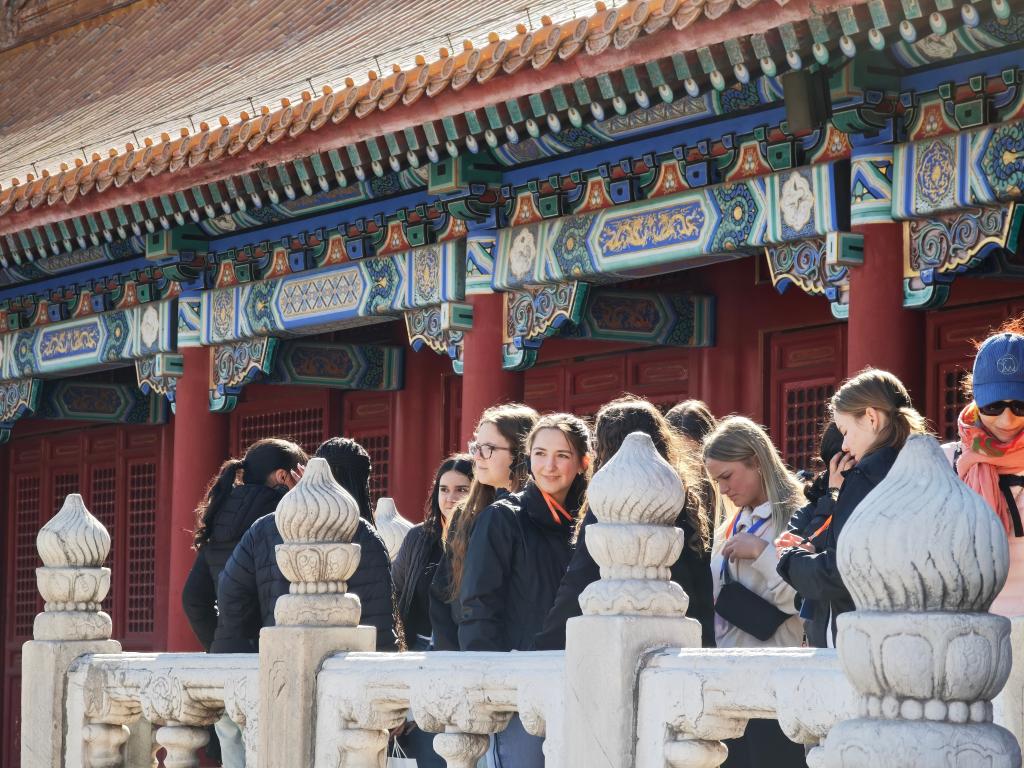3月18日,美國艾奧瓦州高中生研學(xué)團游覽北京故宮。新華社記者 馬卓言 攝