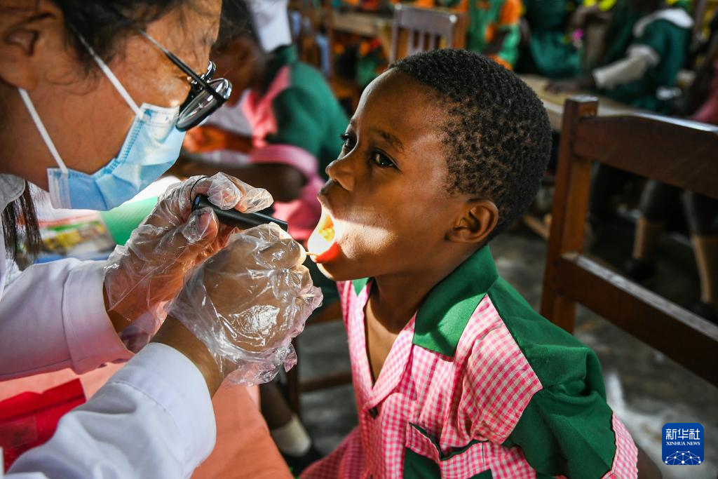 4月3日,在喀麥隆姆巴爾馬約的一所小學(xué),中國(山西)第24批援喀麥隆醫(yī)療隊(duì)姆巴爾馬約分隊(duì)的醫(yī)生為學(xué)生進(jìn)行口腔檢查。新華社發(fā)(科普索攝)