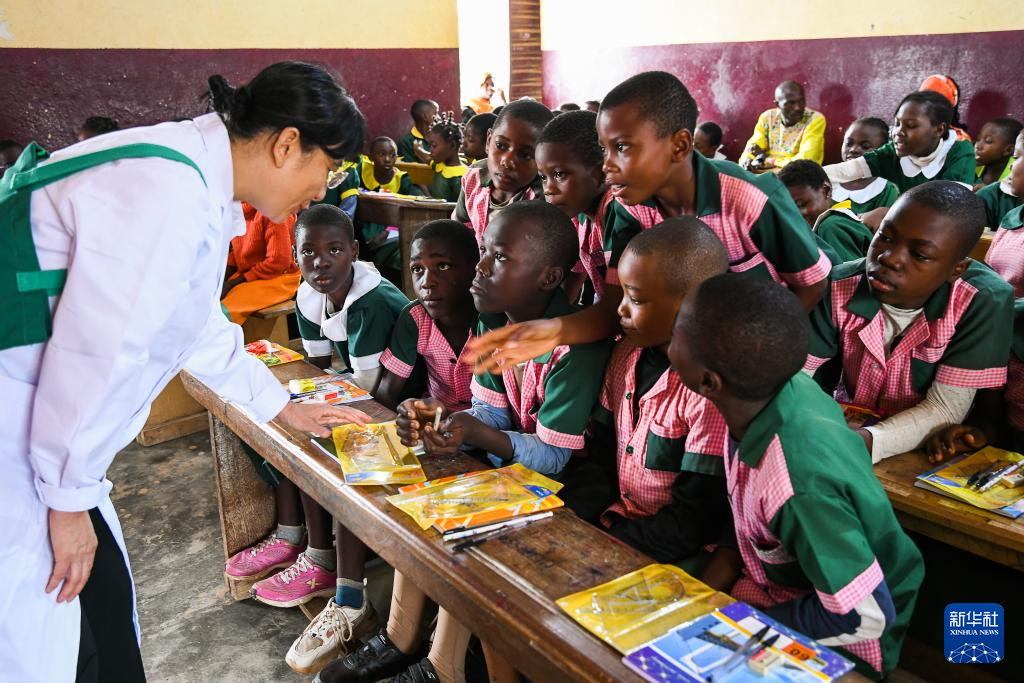 4月3日,在喀麥隆姆巴爾馬約的一所小學(xué),中國(山西)第24批援喀麥隆醫(yī)療隊(duì)姆巴爾馬約分隊(duì)的醫(yī)生與學(xué)生互動。新華社發(fā)(科普索攝)