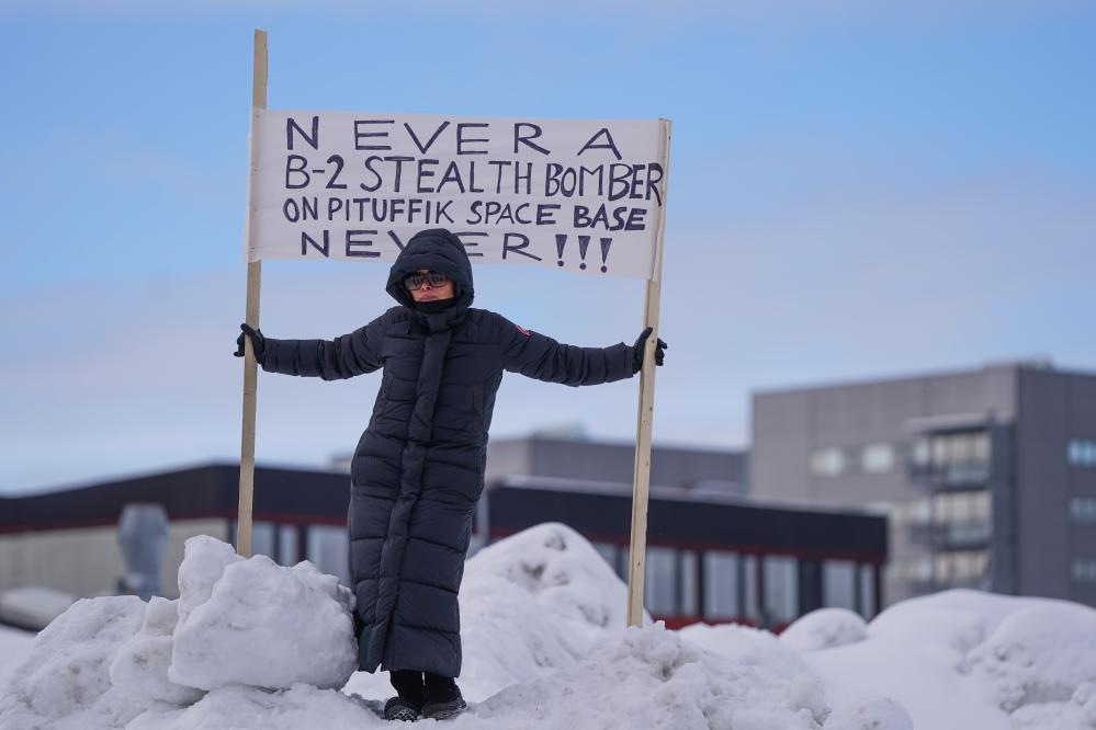 3月28日,美國副總統(tǒng)萬斯訪問位于格陵蘭島北部的美國皮圖菲克太空基地。圖為一名女子當(dāng)天在格陵蘭島首府努克手舉標(biāo)語對此表示抗議。新華社記者 彭子洋 攝