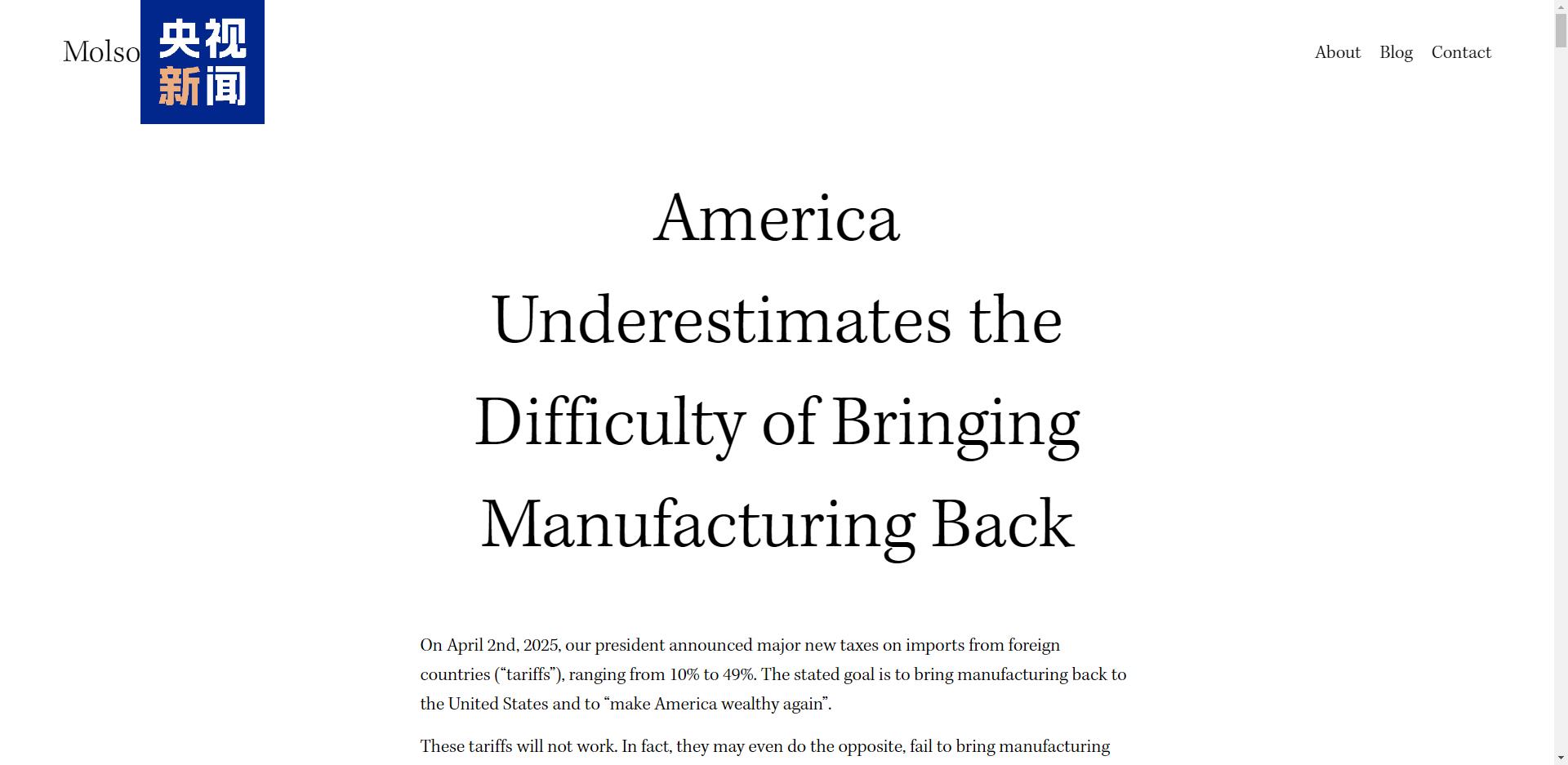 近日,美國一線企業(yè)主莫爾森·哈特結(jié)合自身經(jīng)驗(yàn),發(fā)布了題為《美國低估了制造業(yè)回流的難度》的文章,“控訴”特朗普的關(guān)稅政策,并用多個(gè)刀刀見血的論點(diǎn),揭穿了“關(guān)稅能救‘美國制造’”的致命幻覺。