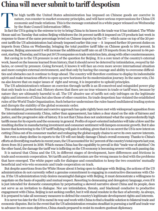 事實上,美國無所不用其極,想要中國在這場由美國挑起的貿易戰(zhàn)中屈服。近日,美國宣布向中國加征34%的“對等關稅”,中國作為回應,決定向美國加征同等比例關稅。周二,白宮稱,除非中國撤銷上周對美國加征的34%關稅,否則將繼續(xù)對中國加征更多關稅。實際上,美國于今年初就已向中國輸美產品加征20%關稅。本周三,面對中國的強硬態(tài)度,美國決定對中國額外加征50%的關稅,累計對華征收的懲罰性關稅稅率達到104%。對此,中國宣布將對美國進口商品加征的關稅由34%提高到84%,并于本周四生效。同時,除其他反制措施外,中國已將18家美國公司列入不可靠實體清單或出口管制管控名單。