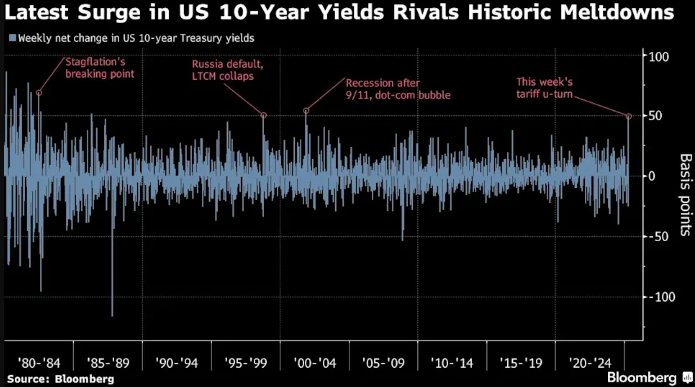 行情數(shù)據(jù)顯示,截止本周五收盤,素有“全球資產(chǎn)定價(jià)之錨”之稱10年期美債收益率已創(chuàng)下了逾20年來的最大單周漲幅(收益率與債券價(jià)格反向),因投資者持續(xù)撤出美國(guó)資產(chǎn)。
