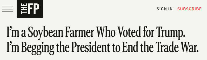 近日,拉格蘭德在The Free Press刊文表示,這場不斷升級的貿(mào)易戰(zhàn)對美國豆農(nóng)來說是個(gè)沉重打擊,因?yàn)橹袊瞧渥畲蟮暮M馐袌觥τ谠S多美國大豆種植戶來說,這仿佛是2018年噩夢般場景的重現(xiàn)。那是特朗普總統(tǒng)的第一個(gè)任期,其采取的關(guān)稅措施使美國農(nóng)業(yè)損失了260億美元,僅大豆產(chǎn)業(yè)就損失了近200億美元。