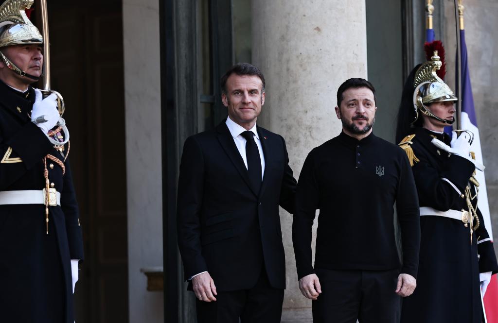 3月26日,法國總統(tǒng)馬克龍(中左)在巴黎總統(tǒng)府愛麗舍宮迎接到訪的烏克蘭總統(tǒng)澤連斯基。新華社記者高靜攝