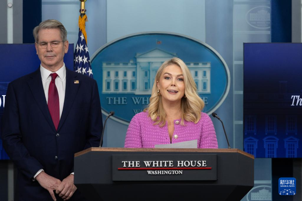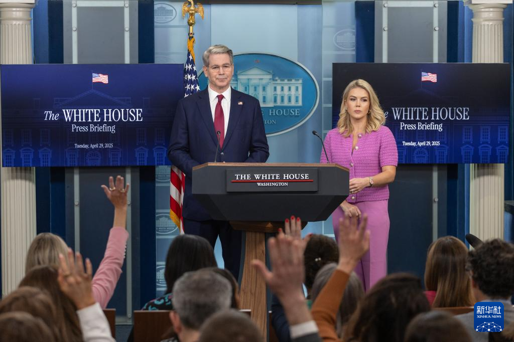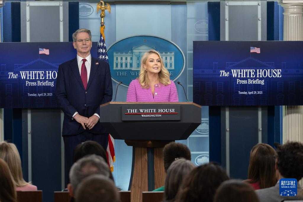 4月29日,美國白宮新聞秘書卡羅琳·萊維特(右)與美國財(cái)政部長斯科特·貝森特在華盛頓白宮出席記者會(huì)。新華社記者 胡友松 攝