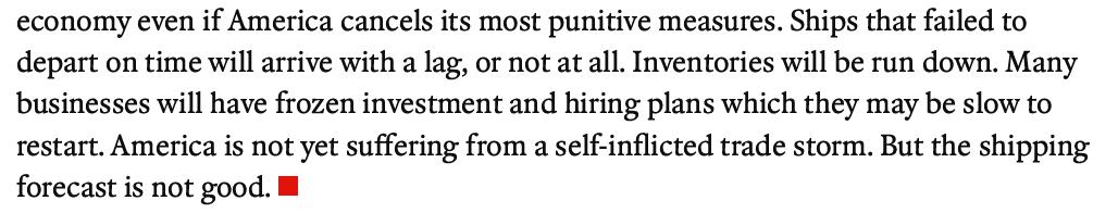 未能按時(shí)起航的船只將會(huì)延遲抵達(dá),或者根本無法抵達(dá)。庫(kù)存將會(huì)耗盡。許多企業(yè)可能已經(jīng)凍結(jié)了投資和招聘計(jì)劃,而且恢復(fù)這些計(jì)劃可能會(huì)很緩慢。美國(guó)尚未遭受自己一手造成的貿(mào)易風(fēng)暴的沖擊。但航運(yùn)前景不容樂觀。