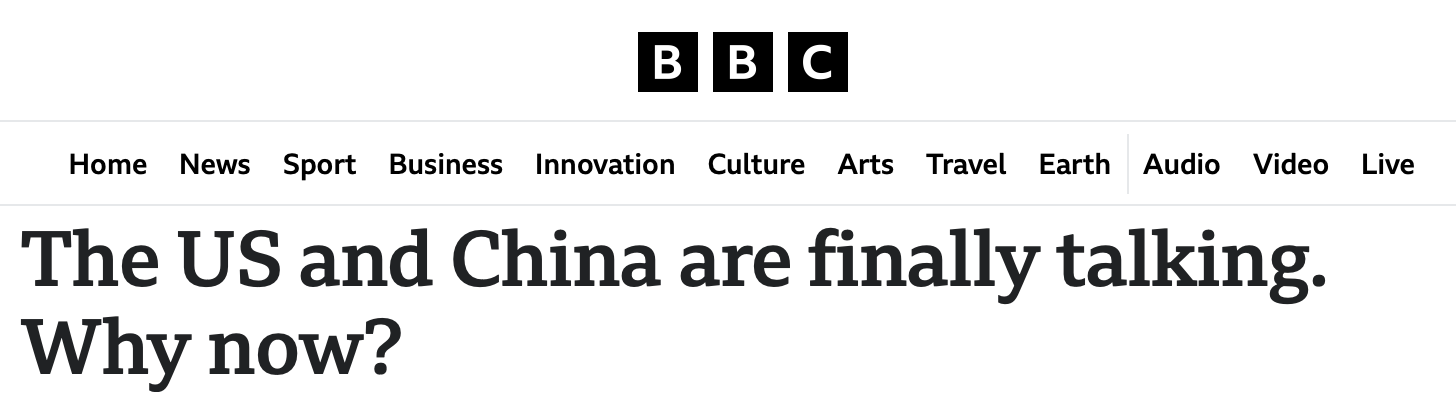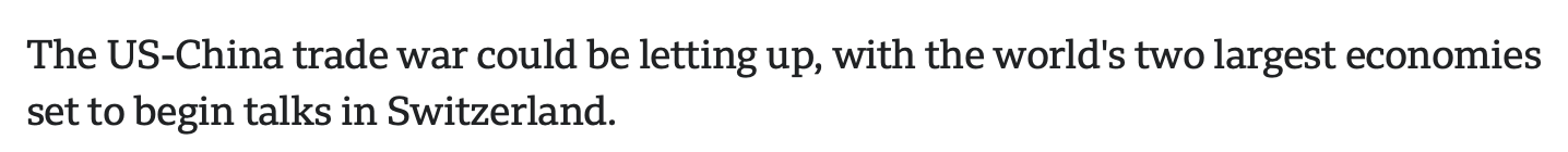 英國(guó)廣播公司的報(bào)道稱(chēng),隨著世界兩大經(jīng)濟(jì)體即將在瑞士開(kāi)始會(huì)談,中美貿(mào)易戰(zhàn)可能正在緩和。