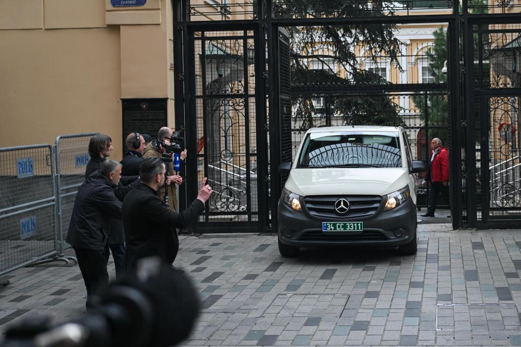 4月10日,在土耳其伊斯坦布爾,載有美國代表的車輛駛離俄羅斯駐伊斯坦布爾總領館。新華社記者劉磊攝