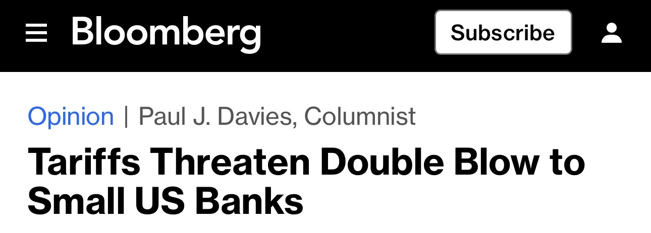 彭博社網站近日的一篇文章分析指出,關稅威脅對美國小型銀行造成雙重打擊。