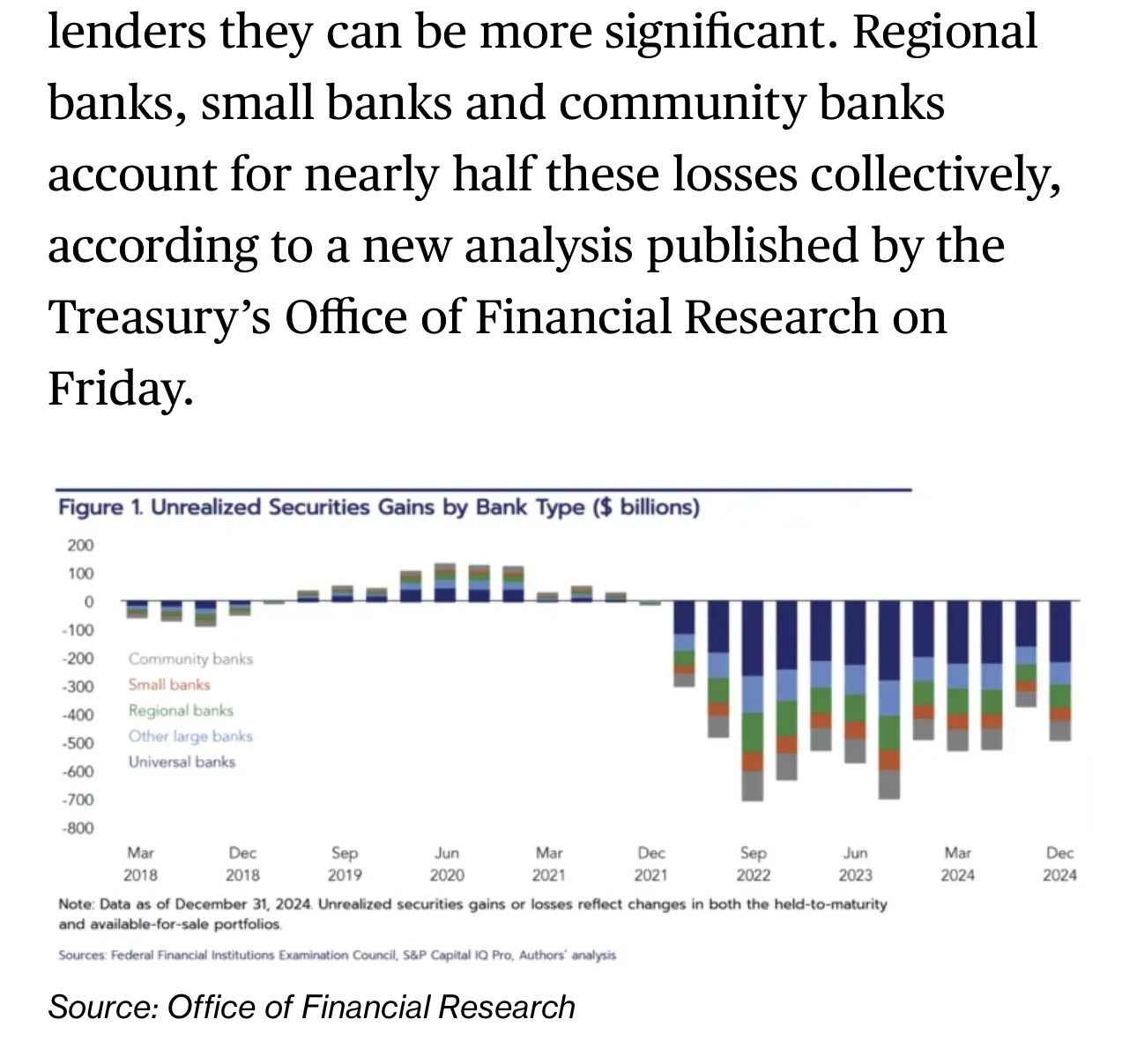 文章回憶道,2022年和2023年,美國國債和抵押貸款債券的“未實現(xiàn)損失”成為貸款機構的一大擔憂,當時利率大幅上升,引發(fā)了以硅谷銀行為首的幾家銀行倒閉?!拔磳崿F(xiàn)損失”,是指在某個資產或證券的市場價值低于其購入價格的情況下,尚未出售或平倉的投資組合中的損失。