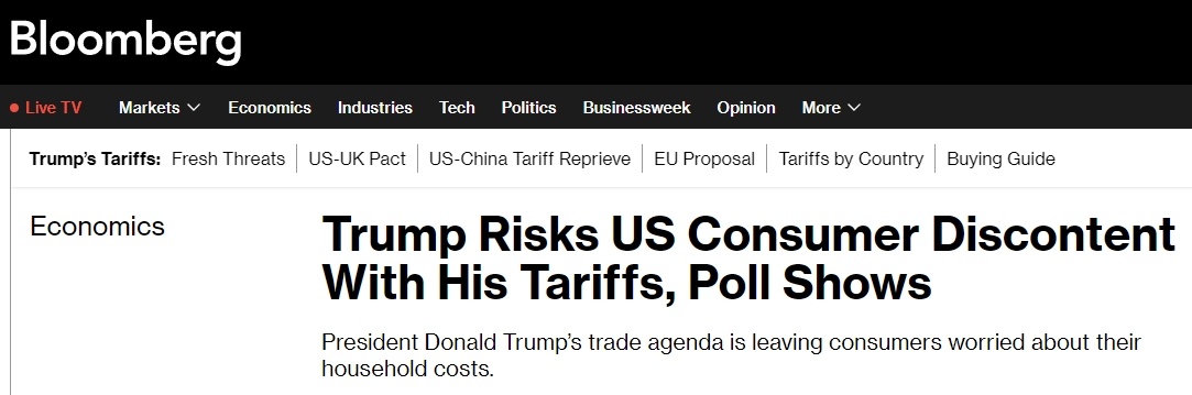 彭博社近日民調(diào)顯示,56%的受訪美國人認(rèn)為,特朗普對(duì)其他國家征收的關(guān)稅對(duì)他們的家庭財(cái)務(wù)狀況產(chǎn)生了不良影響。即使特朗普政府一直在鼓吹加關(guān)稅能讓產(chǎn)業(yè)回流美國并增加財(cái)政收入,約52%的受訪者還是表示,美政府承諾的好處不值得他們?yōu)榇烁冻龅慕?jīng)濟(jì)代價(jià)。