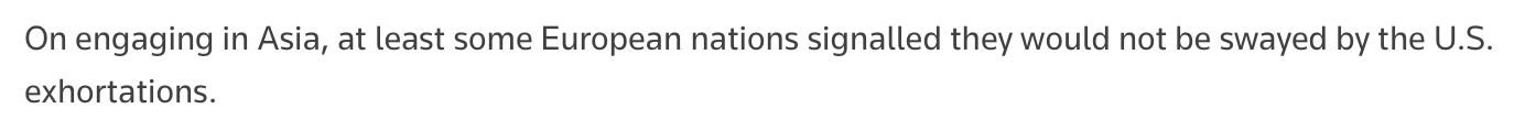 文章注意到歐盟外交與安全政策高級(jí)代表卡婭·卡拉斯的發(fā)言,稱她似乎將歐盟定位為亞洲富有成效的合作伙伴。她認(rèn)為,亞洲或許可以成為一種新選擇,以應(yīng)對(duì)美國(guó)如今的日益反復(fù)無(wú)常、奉行保護(hù)主義,以及不再重視基于規(guī)則的國(guó)際秩序。