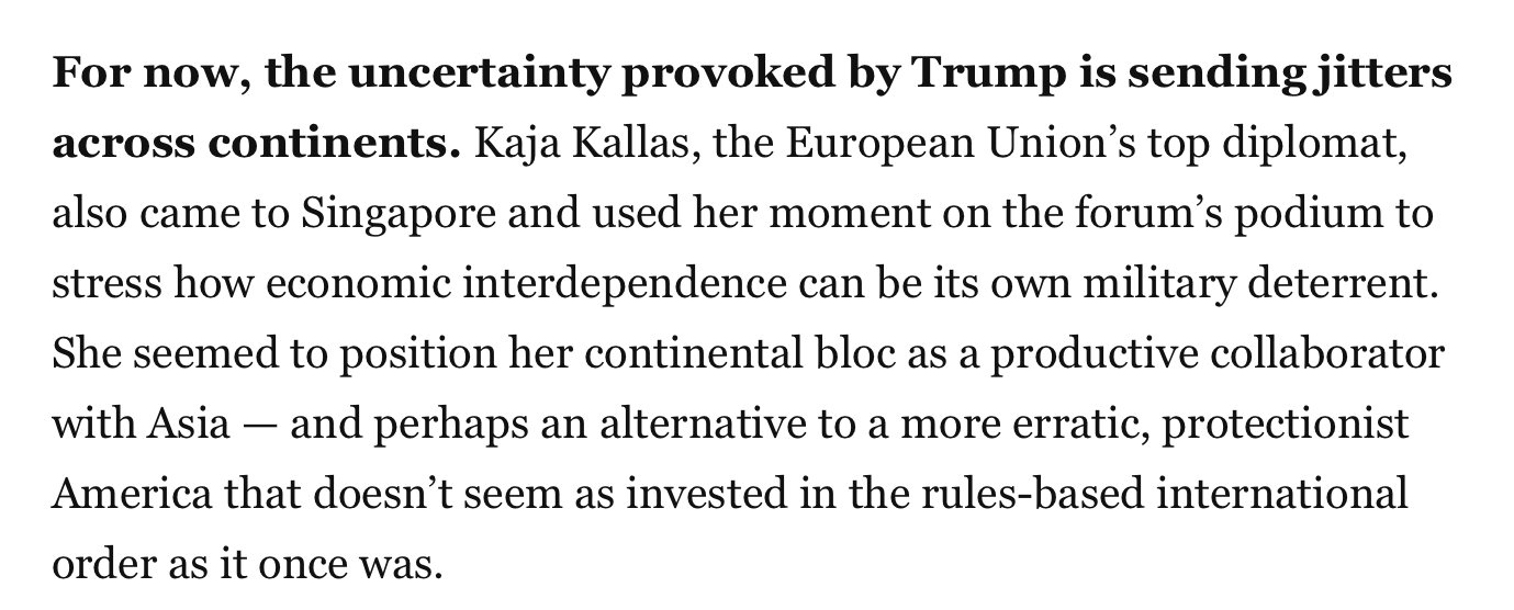 《華盛頓郵報(bào)》的一篇文章則通過(guò)香格里拉對(duì)話會(huì)觀察到,美國(guó)政府濫施關(guān)稅引發(fā)的不確定性,正讓各大洲陷入不安。