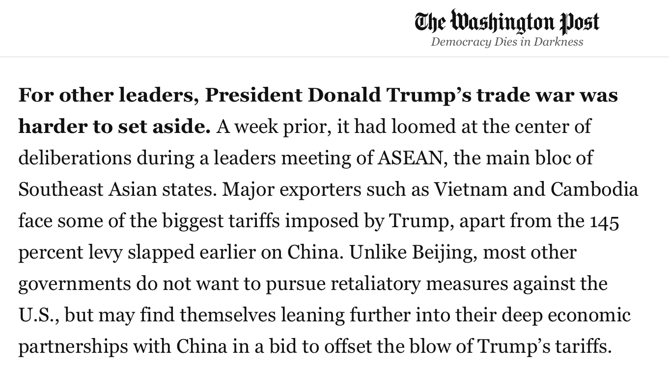 文章說(shuō),盡管大多數(shù)亞洲國(guó)家的政府沒有對(duì)美國(guó)采取反制措施,但它們都更傾向于進(jìn)一步鞏固與中國(guó)的深厚經(jīng)濟(jì)伙伴關(guān)系,以抵消美國(guó)關(guān)稅帶來(lái)的沖擊。