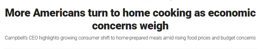 ??怂关斀?jīng)(Fox Business)的報道援引了罐頭食品生產(chǎn)商金寶湯(Campbell's)首席執(zhí)行官米克·比克胡伊森的話稱,隨著經(jīng)濟擔(dān)憂加劇,更多美國家庭選擇在家烹飪以節(jié)省開支。他近期在其公司第三季度財報電話會議上告訴分析師,整個季度消費者情緒持續(xù)疲軟,購物者在食品支出上變得更加謹慎。