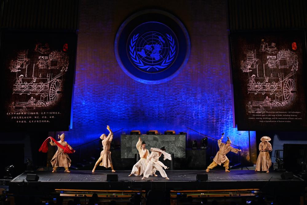 6月9日,在位于紐約的聯合國總部,演員在“跨越山海的文明對話”專場文藝演出上表演舞劇《天工開物》選段。新華社記者 李睿 攝