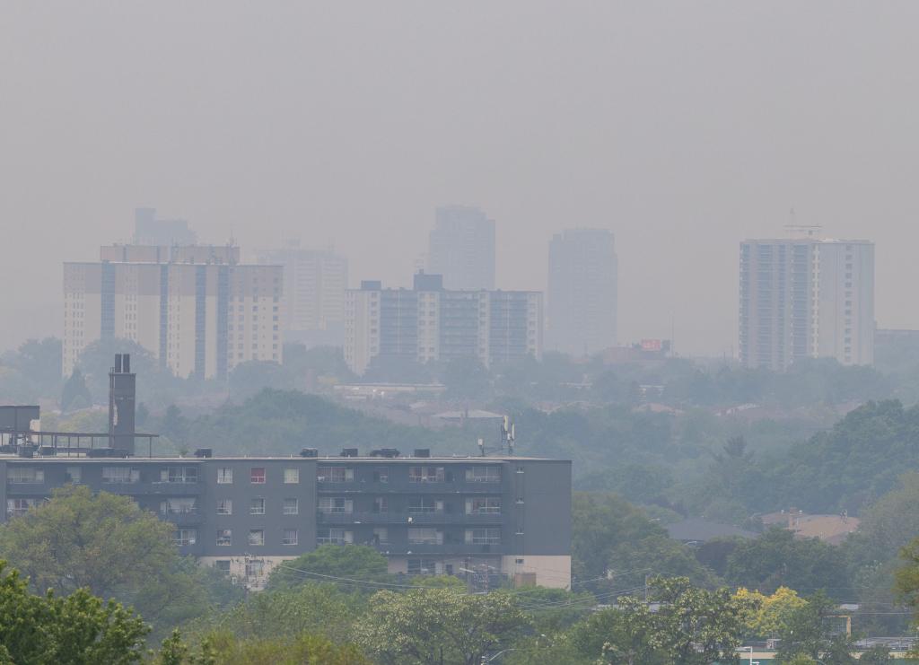 6月6日,加拿大多倫多市區(qū)籠罩在煙塵中。新華社發(fā)(鄒崢攝)