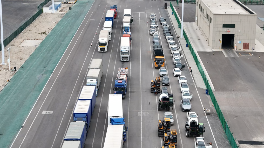 在霍爾果斯公路口岸,貨車(chē)、商品車(chē)、工程車(chē)等排成長(zhǎng)龍,從中國(guó)駛向哈薩克斯坦。
