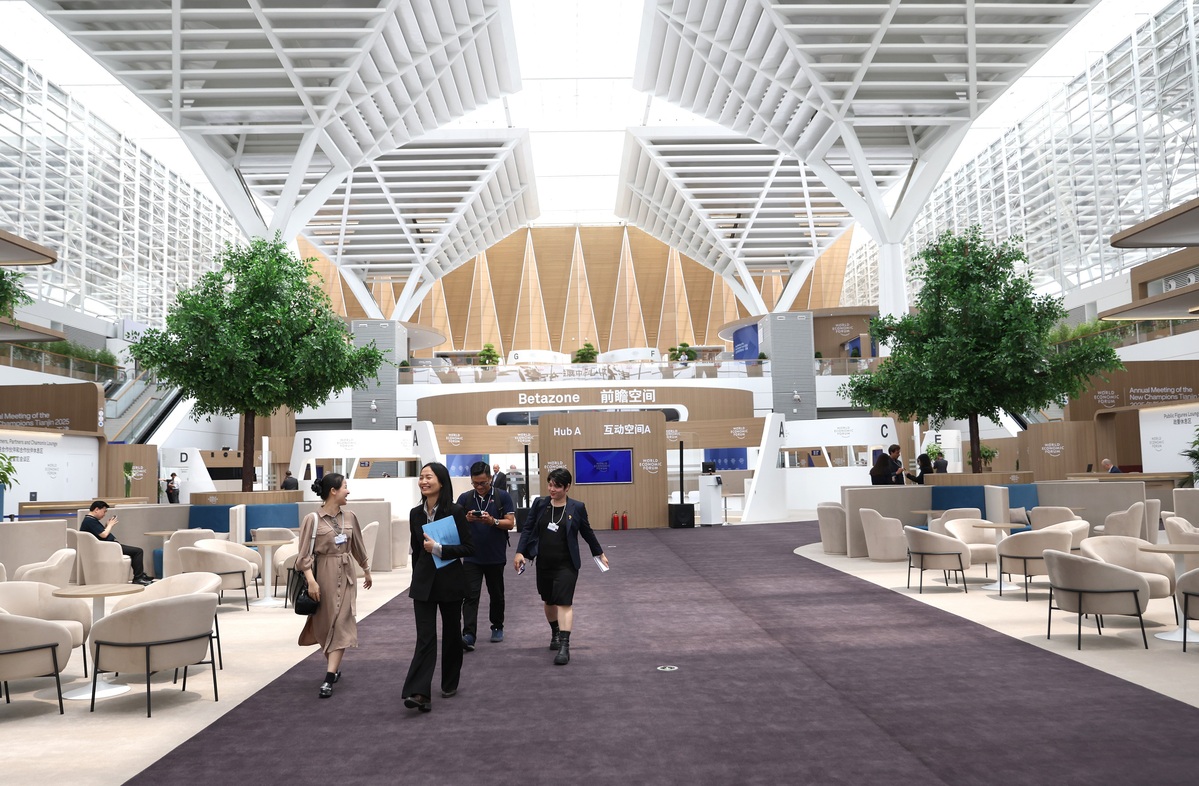 2025年6月23日,嘉賓在國家會展中心(天津)內(nèi)的2025夏季達沃斯論壇新領(lǐng)軍者村交流。