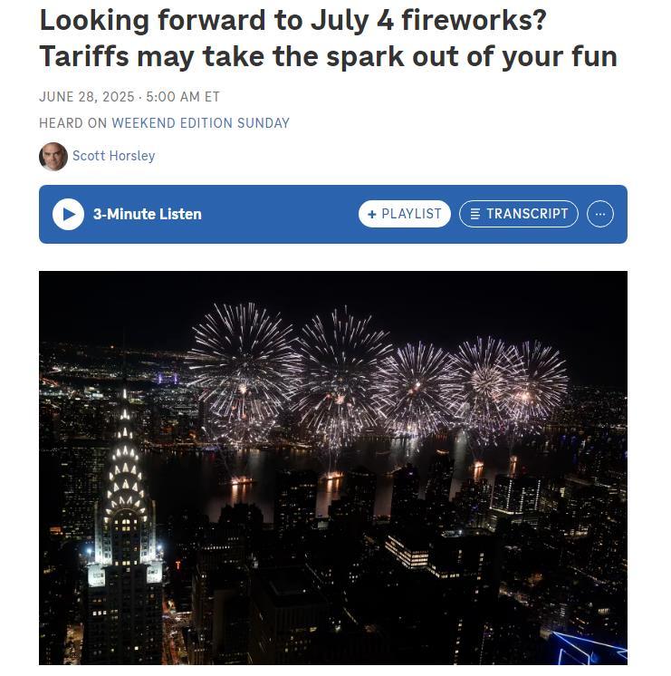 文章說,美國煙花協(xié)會執(zhí)行董事朱莉·赫克曼表示:“中國是全球煙花供應國。美國市場上99%的家庭庭院煙花和90%的專業(yè)表演煙花都產(chǎn)自中國。可以說,中國幾乎是我們唯一的貨源?!比欢捎陉P稅,很多美國經(jīng)銷商停止了煙花進口,赫克曼建議消費者盡早購買煙花,以免斷貨。