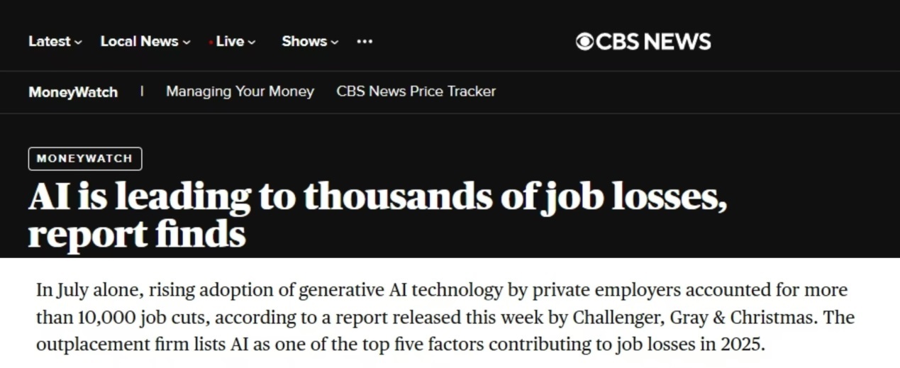 美國(guó)哥倫比亞廣播公司刊發(fā)的一篇報(bào)道認(rèn)為,人工智能(AI)技術(shù)已成為美國(guó)企業(yè)今年崗位流失的五大主因之一。報(bào)道說(shuō),自2023年以來(lái),超2.7萬(wàn)個(gè)崗位直接因AI興起被取代,僅今年7月,美國(guó)私營(yíng)企業(yè)因加速采用AI技術(shù),已裁撤超1萬(wàn)個(gè)工作崗位。