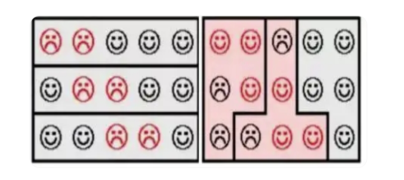 上圖是個簡化的例子,通過不同的區(qū)域劃分,黑方在左圖的每個區(qū)域中都占據(jù)多數(shù),對紅方取得了3:0的優(yōu)勢。但按右圖的方式劃分,紅方反而取得了2:1的領先。