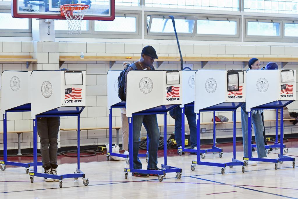 2024年11月5日,選民在美國紐約曼哈頓一處投票站填寫選票。新華社記者李睿攝
